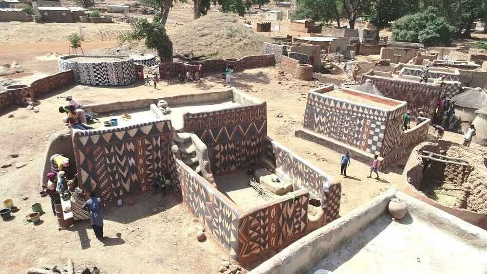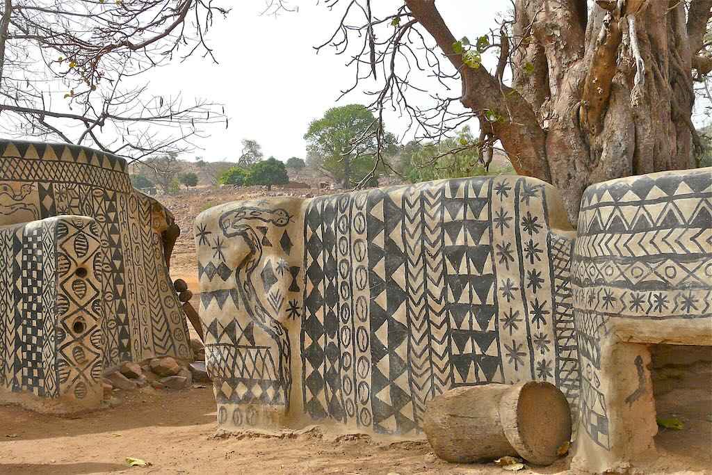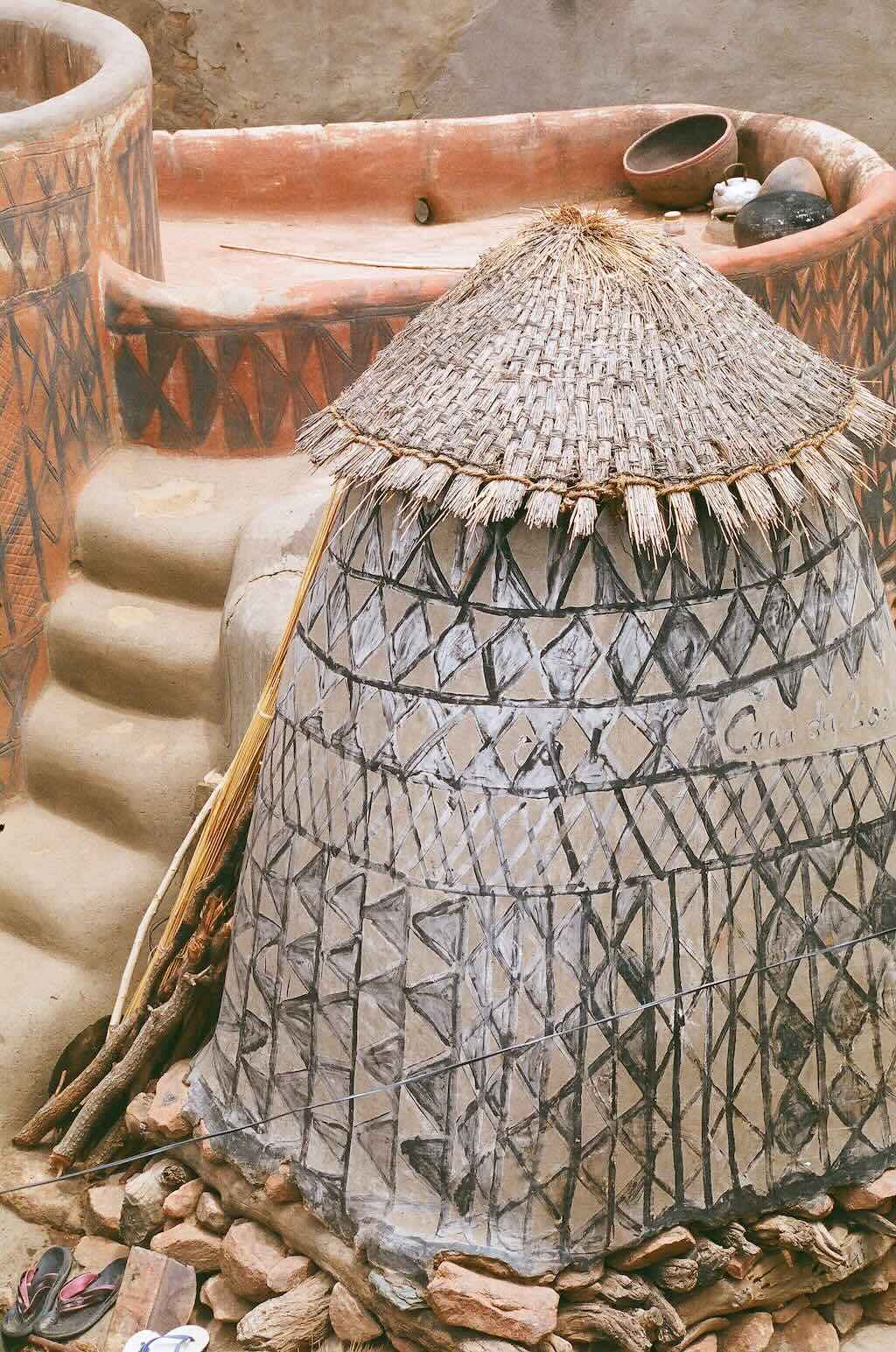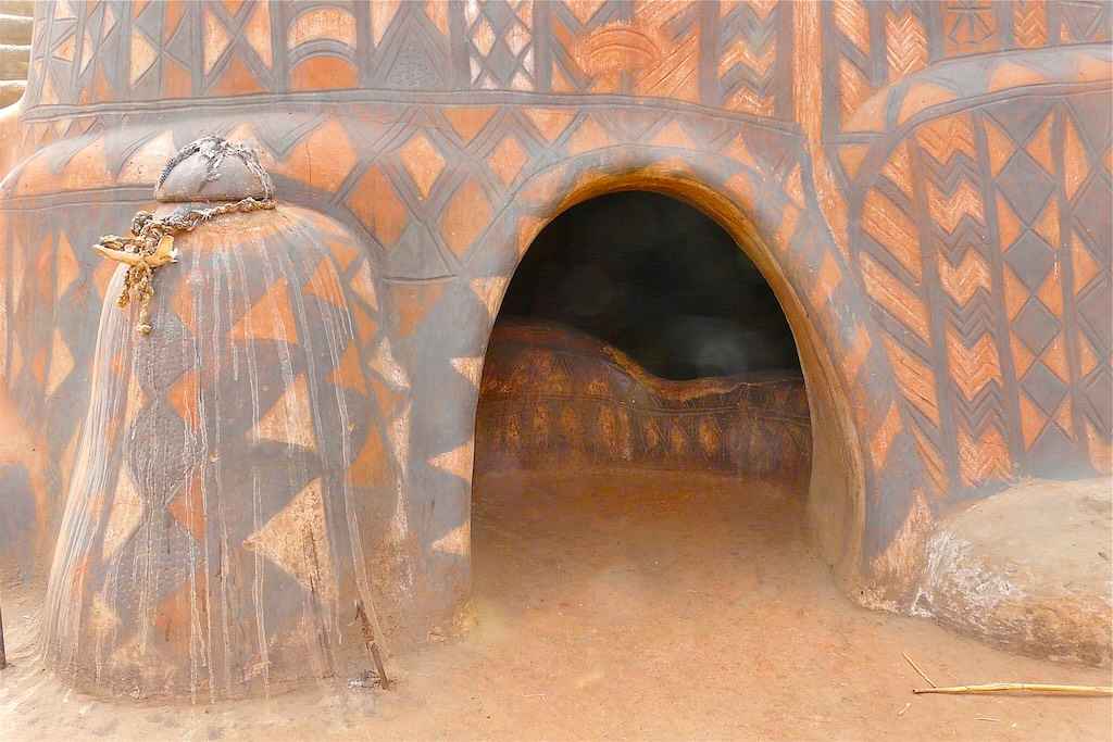The Kassena people, an ethnic group in Burkina Faso and Ghana, are skilled ceramicists, making pottery and masks, but they also use these skills when building and painting their houses. The buildings are made by the men, from a mixture of earth, cow dung, wood and straw. These natural materials form thick walls that stay cool in the heat and maintain warmth at night. The buildings are then painted by the Kassena women, usually before the rainy season. The best-known example of Kassena architecture is the Royal Court of Tiébélé in the south of Burkina Faso, which is where the royal family live.