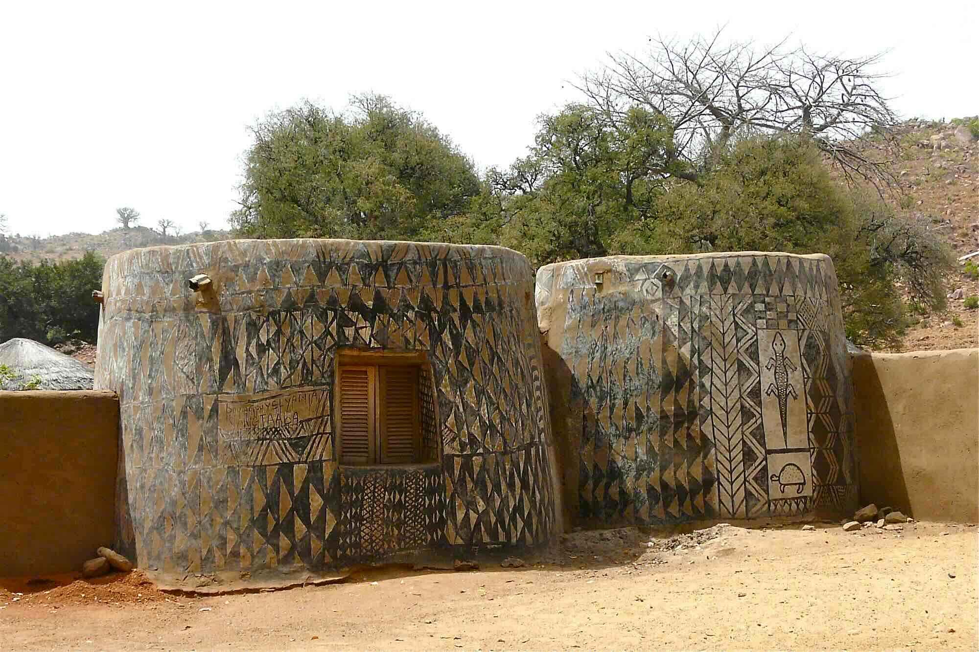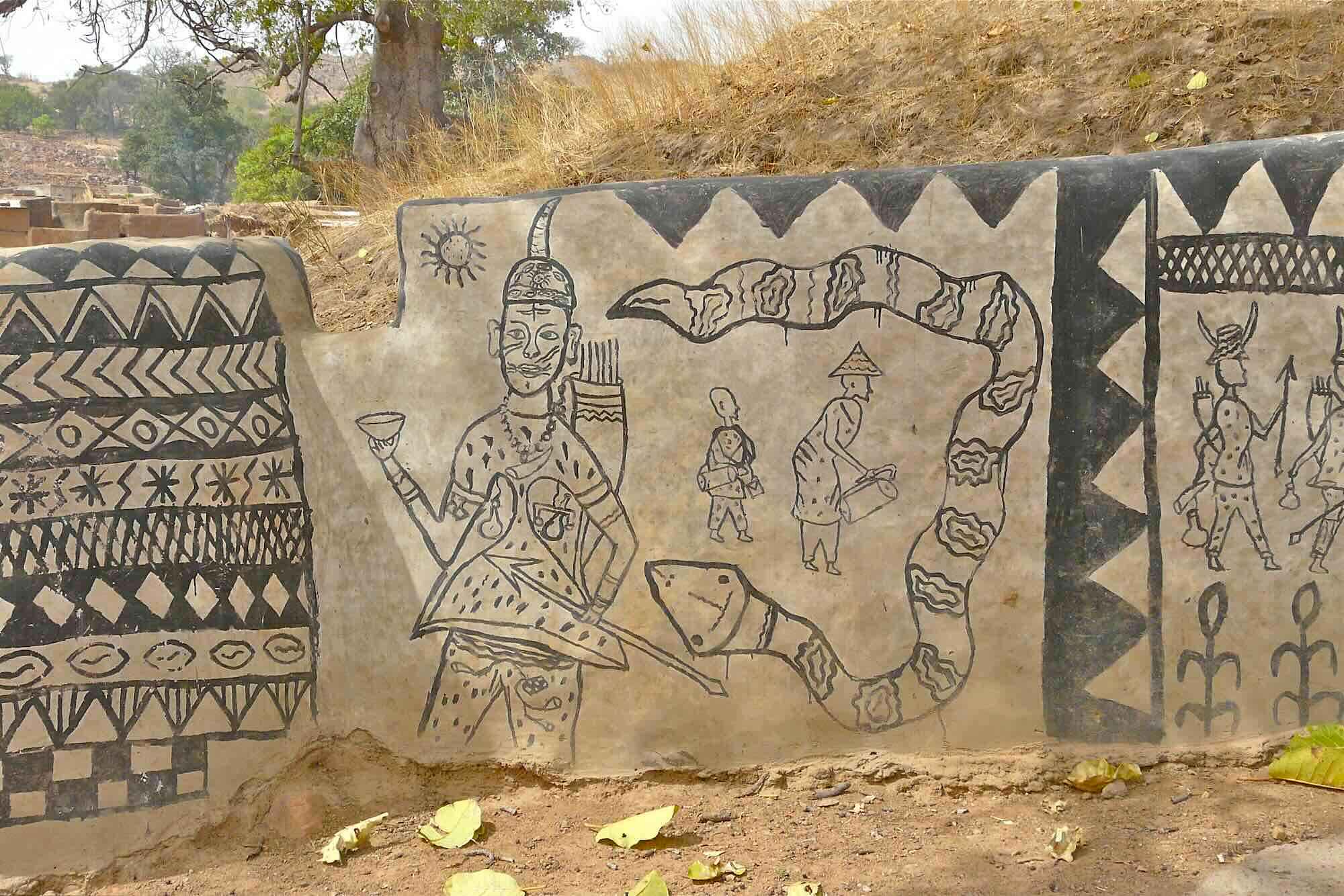 Each individual building has unique patterns and symbols, and the walls are repainted every few years. The snake is a common protective symbol, warding off disease, while lizards and crocodiles dispel evil. Some of these creatures are sculpted rather than painted, so they stand out in relief against the walls of the buildings. One of the most common symbols is the calabash, which is depicted as half circles, or as broken shards in the form of diagonal motifs. The red, white and black colours used for the murals are made from natural pigments, with red from laterite, white from chalk and black from basalt. The colours themselves carry meaning too, with red symbolising courage, black representing night and the spirits, and white signifying honesty.