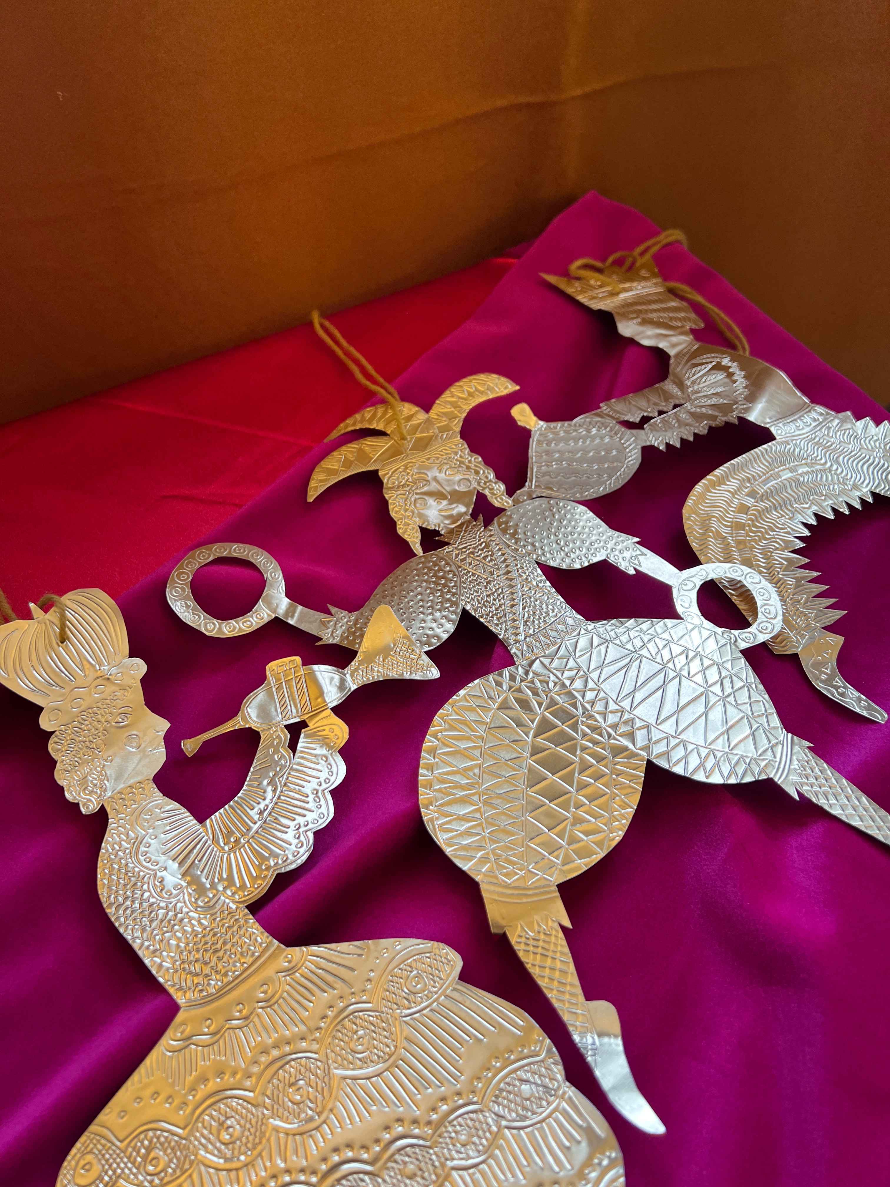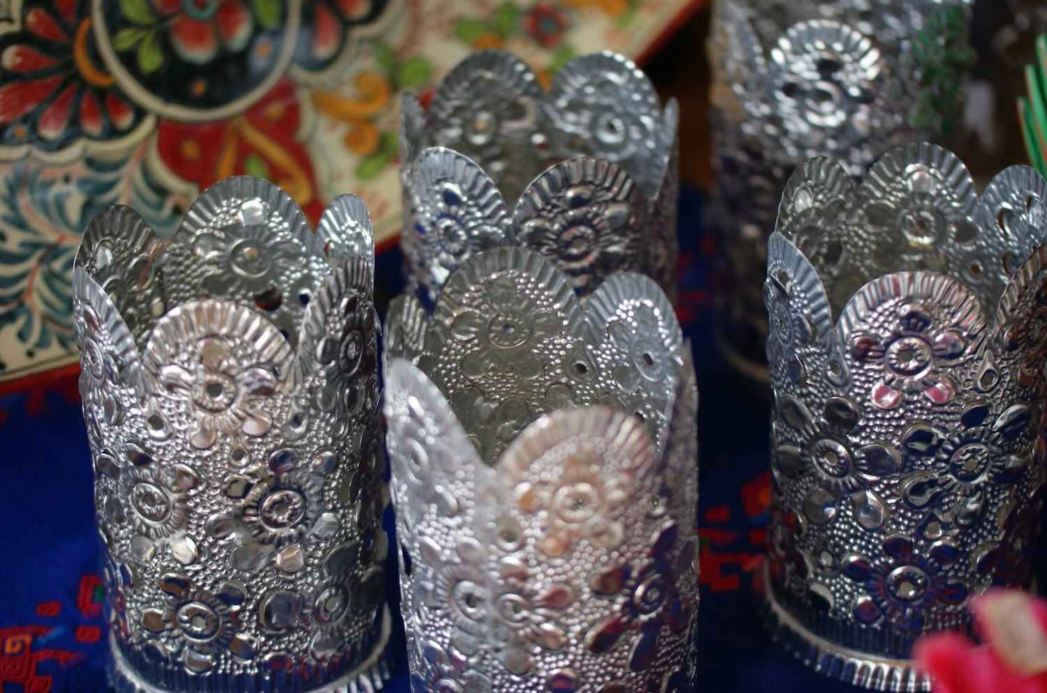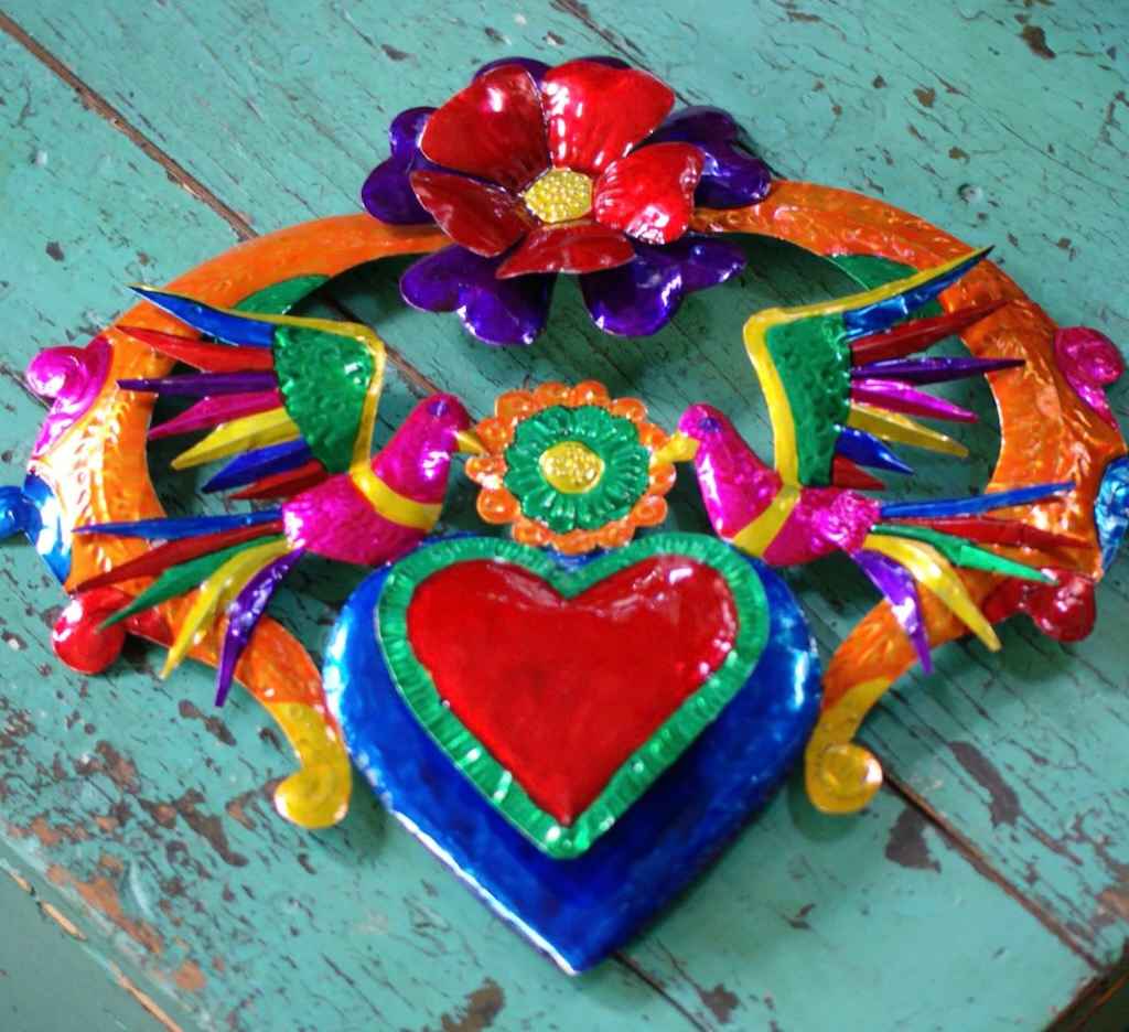 In Mexico, particularly in Oaxaca, tin relief art is a centuries-old art form. The tin pieces are often painted in vibrant colours, and used in jewellery as earrings, candle holders, or as larger decorative hangings.
