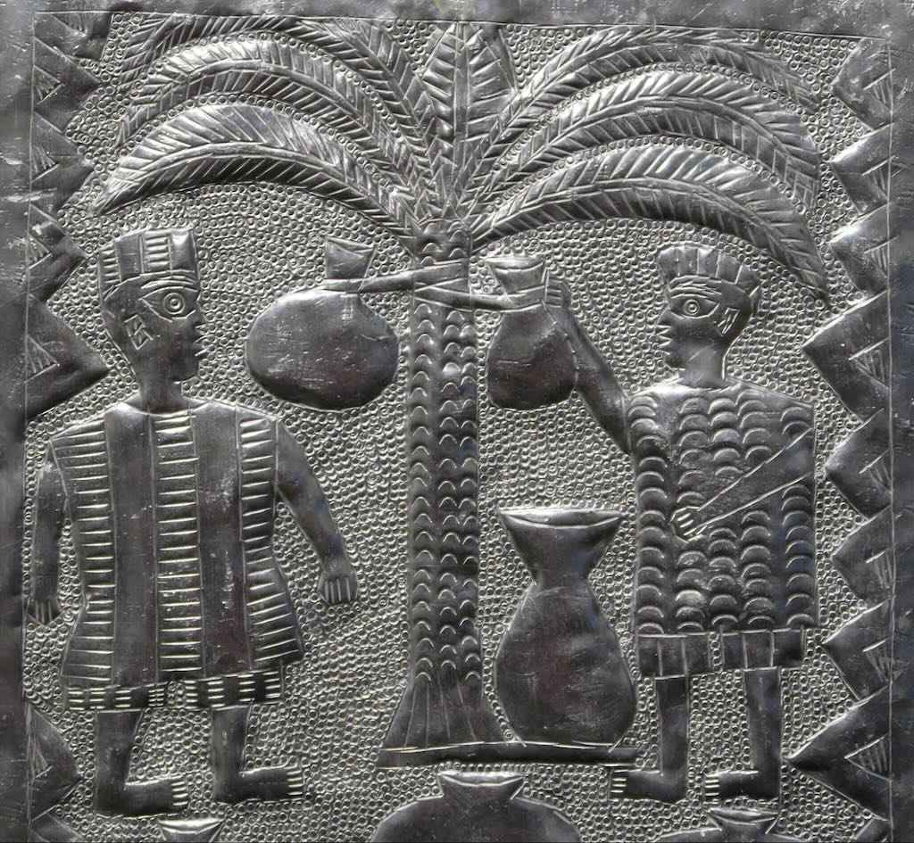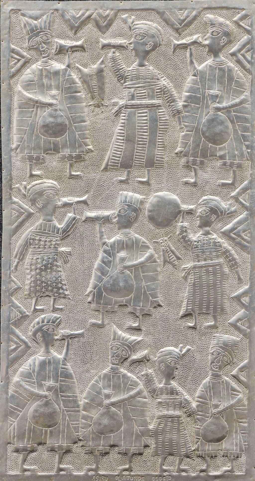 Last century, the Nigerian artist Asiru Olatunde (1918 – 1993), also a blacksmith, developed a form of aluminium art based on metal relief work. Olatunde hammered intricate details and stories into aluminium, creating stunning narrative artwork. He then trained his relatives and other students in the artform (you can see and purchase his students’ work here).