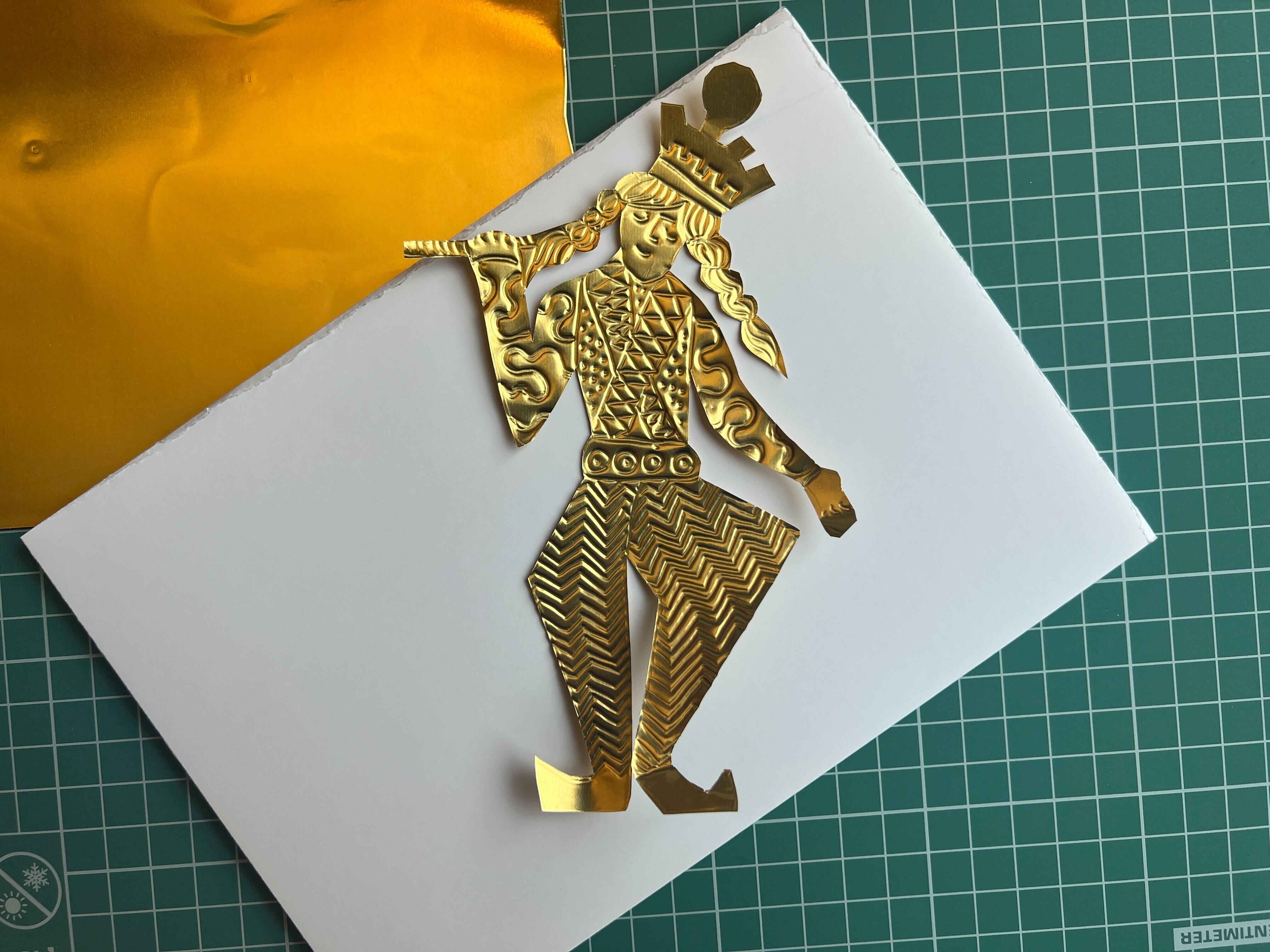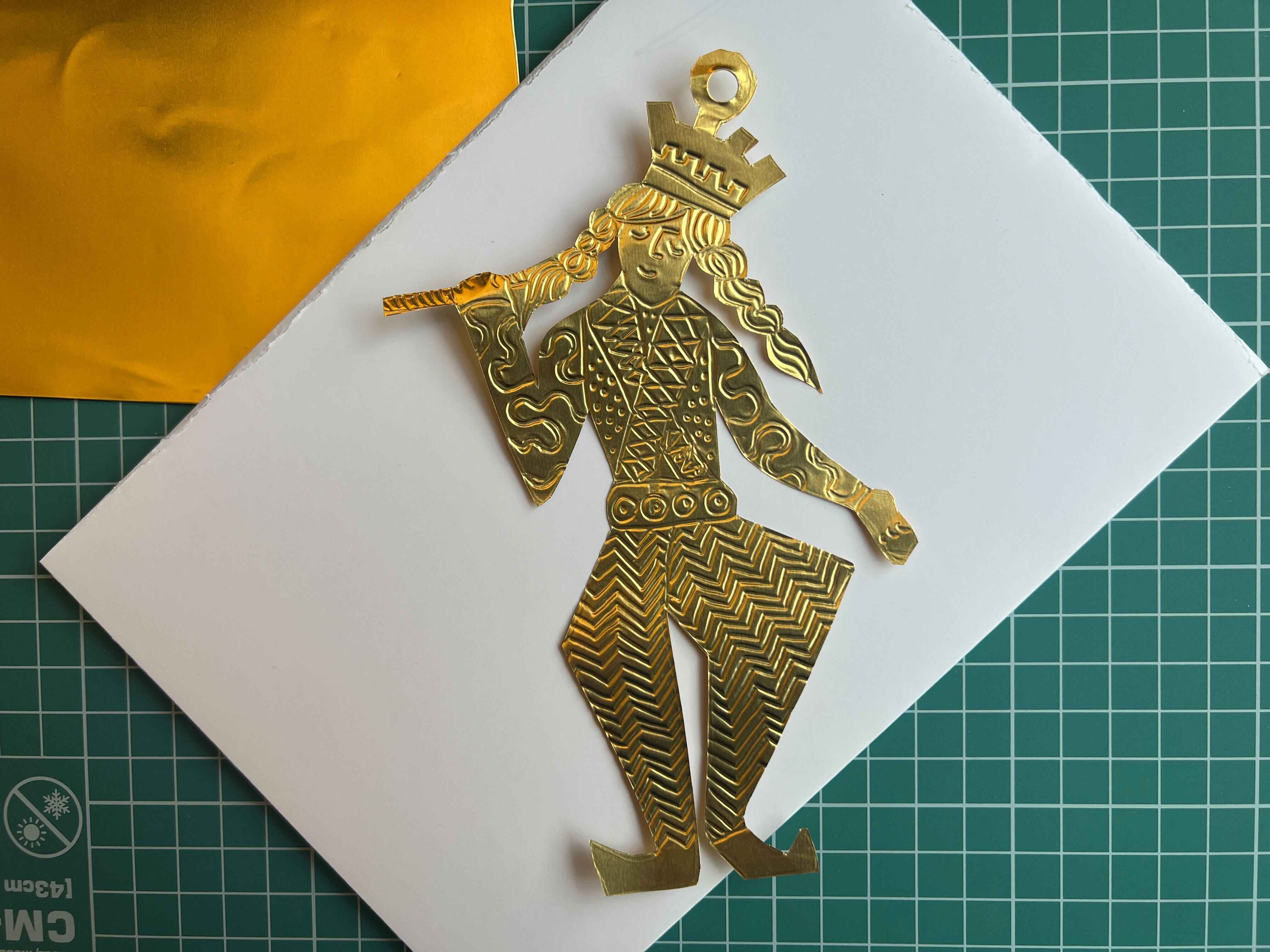 - Be careful about marking the foil in areas you don't want to have lines and also take care when doing the face as you really only have one attempt. Whilst you can get light embossed marks back out of the foil again using the rolling pin, if you have pressed hard you won't be able to get the lines out. Don't let this worry you though... even if it doesn't look exactly how you planned, the expressions are always charming!