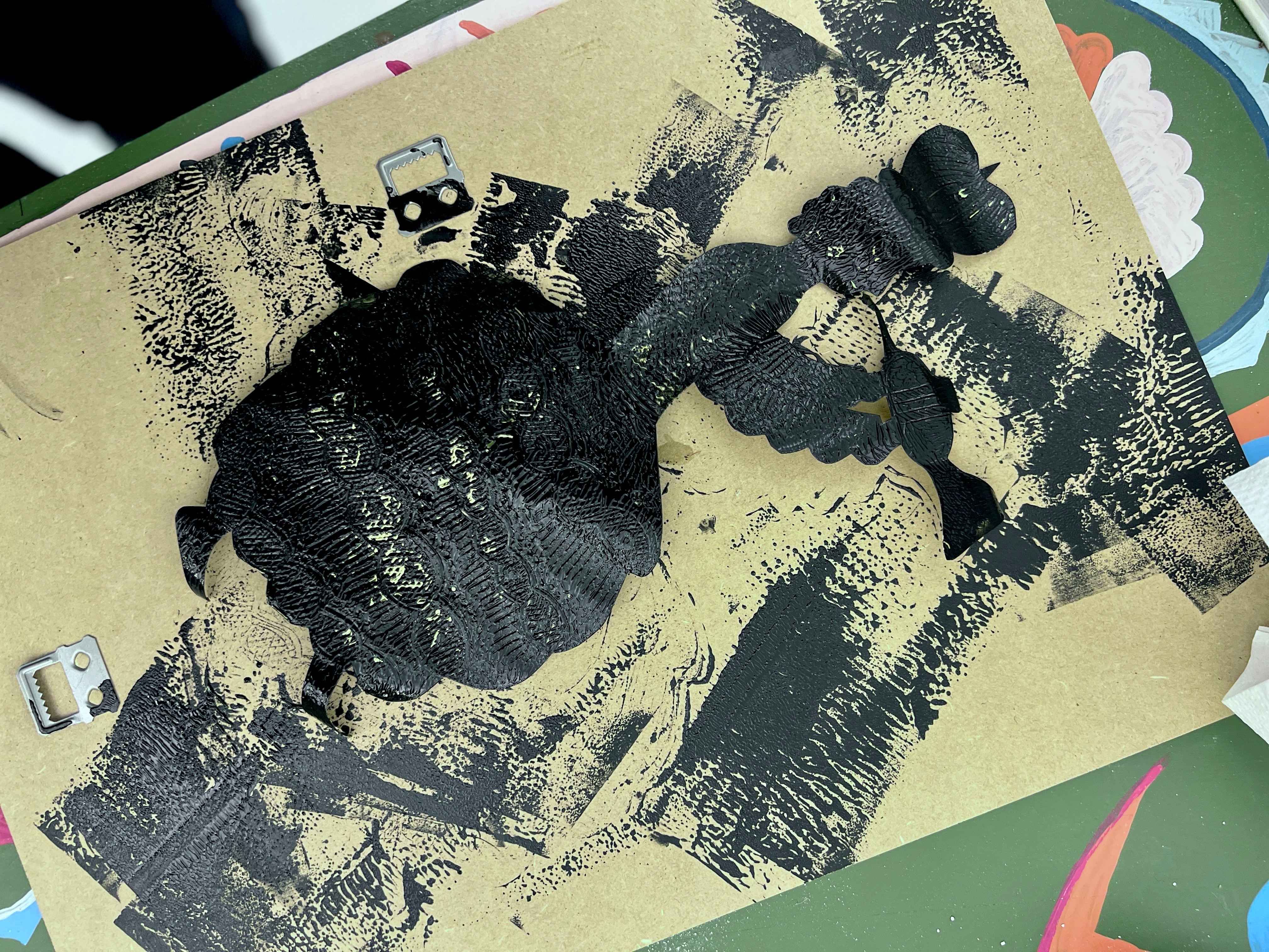- You can also roll ink over your embossings and then wipe it away so that the ink only sits in the grooves you've made. This makes it easier to see the embossed marks from a distance. For this you will need to use a standard lino-printing ink which you will sponge on and then rub back off with kitchen roll, so it only stays in the cracks.